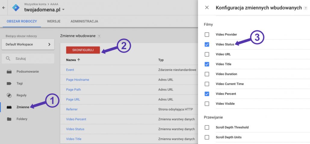 Porada: Teksty w podwójnych klamrach np. “{{Video Title}}”, “{{Video Status}}” itd., są to tzw. zmienne wielokrotnego użytku (inaczej zwane makra), pod którymi kryją się różne wartości, zależnie od obiektu, którego dotyczą. Możemy to porównać do numeru telefonu kolegi lub koleżanki, który zapiszemy w GTM jako “{{Nr telefonu}}”. Teraz jeżeli chciałbyś podać komuś numer do kolegi Adama lub przyjaciółki Ani, to wartość (numer telefonu) przekazana przez Ciebie będzie inna, chociaż użyliśmy słowa telefon, a GTM użyje {{Nr telefonu}}. Mam nadzieję, że od teraz nie będziesz miał problemu ze zrozumieniem, czym jest zmienna wielokrotnego użytku w podwójnych nawiasach klamrowych :-).