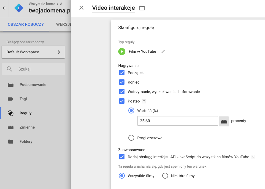 Wybieramy typ reguły “Film w YouTube”, który pozwoli nam użyć zmiennych zaznaczonych w kategorii Video. Teraz przechodzimy do konfiguracji, gdzie znajdziemy opcje: “Początek”, “Koniec”, “Wstrzymanie, wyszukiwanie i buforowanie” oraz “Postęp”. Jeżeli interesują nas te interakcje, zaznaczamy pojedynczą lub wszystkie. Pozycja ‘Postęp’, wymaga przynajmniej jednej wartości. Mamy do dyspozycji opcję w procentach lub sekundach. Opcję “Wartość(%)” podajemy w postaci liczby całkowitej, ze zbioru do 1 do 100. Natomiast opcja “Progi czasowe” wymaga przynajmniej jednej liczby całkowitej (od 1 w wzwyż), która określa czas w sekundach.