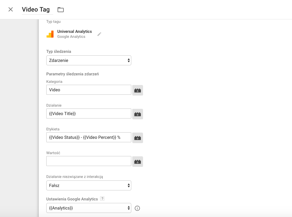W polu “Etykieta” wstawiamy zmienną “Video Status” oraz “Video Percent”. Dodaliśmy m. in. spację z myślnikiem, aby wyświetlanie tych danych w Google Analytics było czytelniejsze. Dodaliśmy również znak “%” na końcu pola, aby w raportach zdarzeń GA liczba procentowa była z symbolem “%”. Pomoże nam to w łatwiejszym odczytaniu tego, czego dotyczą dane.