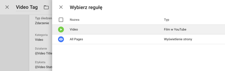 Zadaniem utworzonej reguły jest “nasłuchiwanie” i wysyłanie informacji do Google Analytics, w momencie kiedy nastąpi interakcja odbiorcy z naszym filmem za pomocą tagu, który utworzymy w następnym kroku.