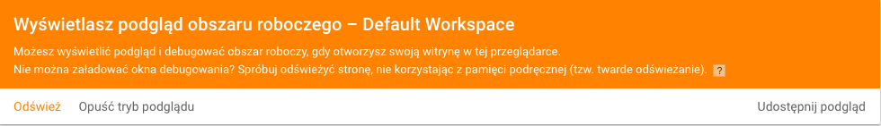 Możliwe, że do tej pory nie stosowaliście “debugowania”, czyli po prostu nie sprawdzaliście czy w GTM wszystko działa. Debugowanie włączamy przyciskiem “Podgląd”, który znajdziemy w górnym prawym rogu obok przycisku “Prześlij”. Po aktywacji podglądu w panelu na pomarańczowym tle pojawi się informacja, gdzie będziemy mogli wyjść z trybu podglądu za pomocą przycisku “Opuść tryb podglądu” oraz będziemy mogli przesłać możliwość osobom, które nie mają dostępu do naszego panelu GTM, opcje debugowania za pomocą przycisku “Udostępnij podgląd”.