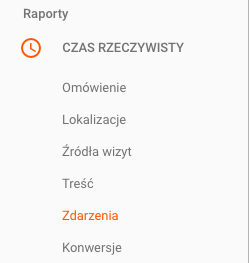 Przechodzimy do naszego Google Analytics i otwieramy raport “CZAS RZECZYWISTY”, po czym wybieramy pozycje “Zdarzenia”.