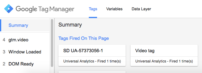 Po włączeniu opcji podglądu, przechodzimy na naszą stronę, gdzie na dole pojawi się pole podglądu debugowania. Kontrolnie włączamy film na naszej stronie i jeżeli wszystko jest w porządku to zobaczymy, że nasz ‘Video Tag’ został “odpalony”. Znajdziemy go w obszarze pod napisem “Tags Fired On This Page”.
